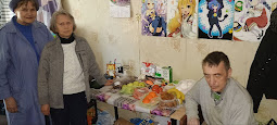 Так і родина Сергія Ємєльяненко. Воли жили і в окупації там, поки не знесло дах їхнього дома, потім наважилися на евакуацію. Їх вивезли до Харкова і розмістили у кімнаті гуртожитку, де зараз живуть переселенці. У цій родині троє інвалідів і один молодий хлопець, якому 17 років, учень училища. Наші волонтери Євдокія Венгер та Валентина Дацко взялися їм допомагати. Перш за все це психологічна допомога – прийняти непереборні обставини, взяти себе в руки, забезпечити необхідним. Вже тричі наші волонтери відвідали родину, нелегко було встановити довірливі відносини. Процес триває. Приносять необхідні гігієнічні товари, продукти. Ну і безперечно розмови, з’ясування потреб і відповідно своїх можливостей. Як ви розумієте, фотографуватися їм не на часі зараз.Велика